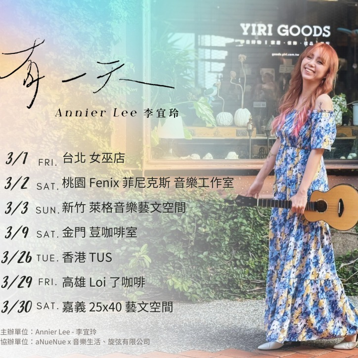 2 年 ago1 週 ago By Yun-Ping Liu Annier Lee 《有一天》專輯巡迴 專屬樂手 2023年擔任烏克麗麗演奏家Annier老師全新個人演奏專輯《有一天》製作人,從專輯的選曲、寫歌、錄音、後製等...Continue reading